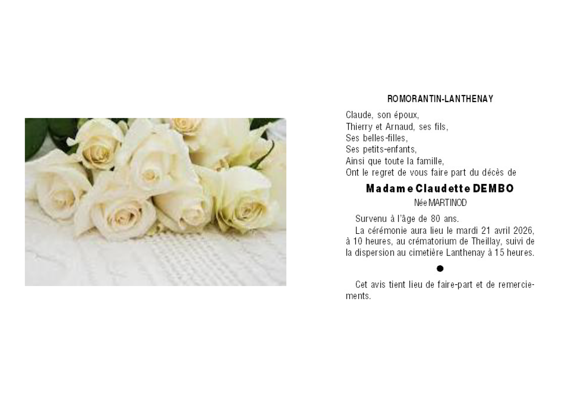 Cet espace « condoléances » est dédié à la mémoire de Madame Claudette DEMBO née MARTINOD.