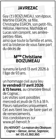de Madame Christiane BOIZUMEAU née LESPARRE