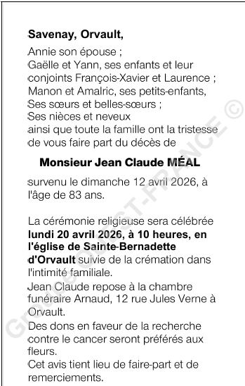 Cet espace « condoléances » est dédié à la mémoire de Monsieur Jean MÉAL.