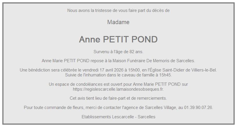 Cet espace « condoléances » est dédié à la mémoire de Madame Anne PETIT POND.