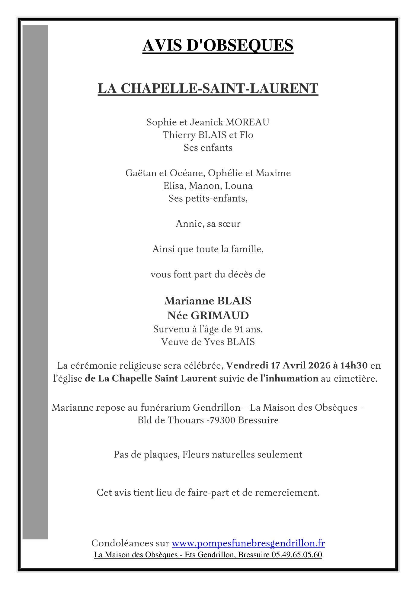 Cet espace « condoléances » est dédié à la mémoire de Madame Marianne BLAIS née GRIMAUD.