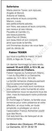 Décédé à Challans (85300) le mardi 14 avril 2026