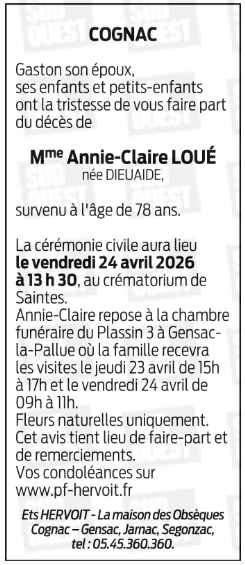 Cet espace « condoléances » est dédié à la mémoire de Madame Annie-Claire LOUÉ née DIEUAIDE.