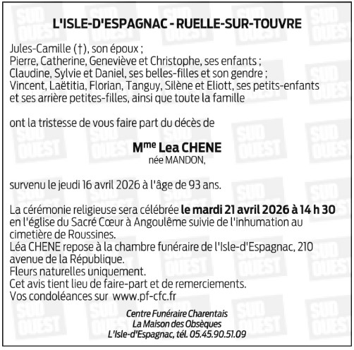 Cet espace « condoléances » est dédié à la mémoire de Madame Léa CHÊNE née MANDON.