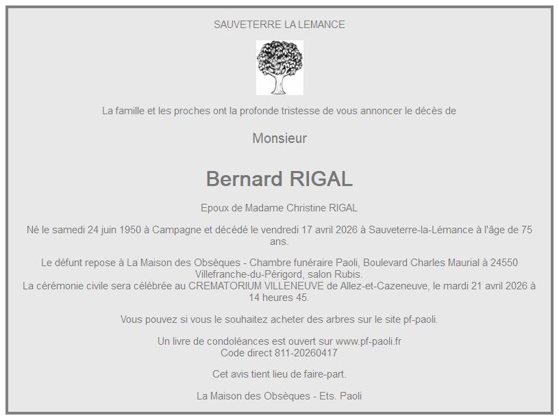 Cet espace « condoléances » est dédié à la mémoire de Monsieur Bernard RIGAL.