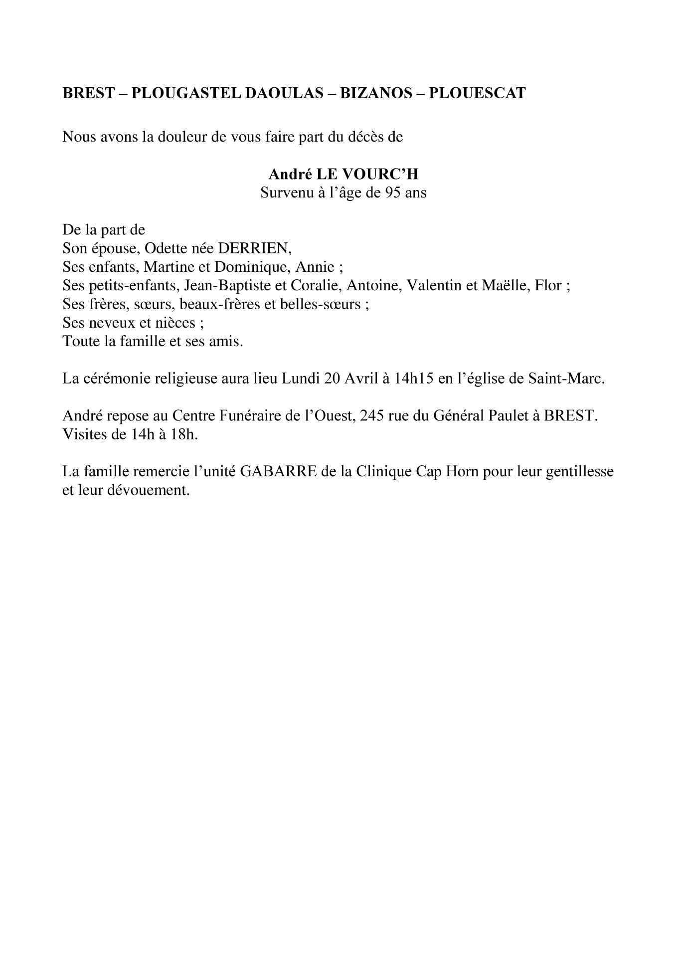 Cet espace « condoléances » est dédié à la mémoire de Monsieur André LE VOURC'H.