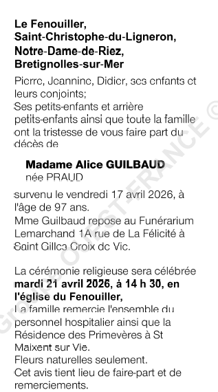 Cet espace « condoléances » est dédié à la mémoire de Madame Alice GUILBAUD née PRAUD.