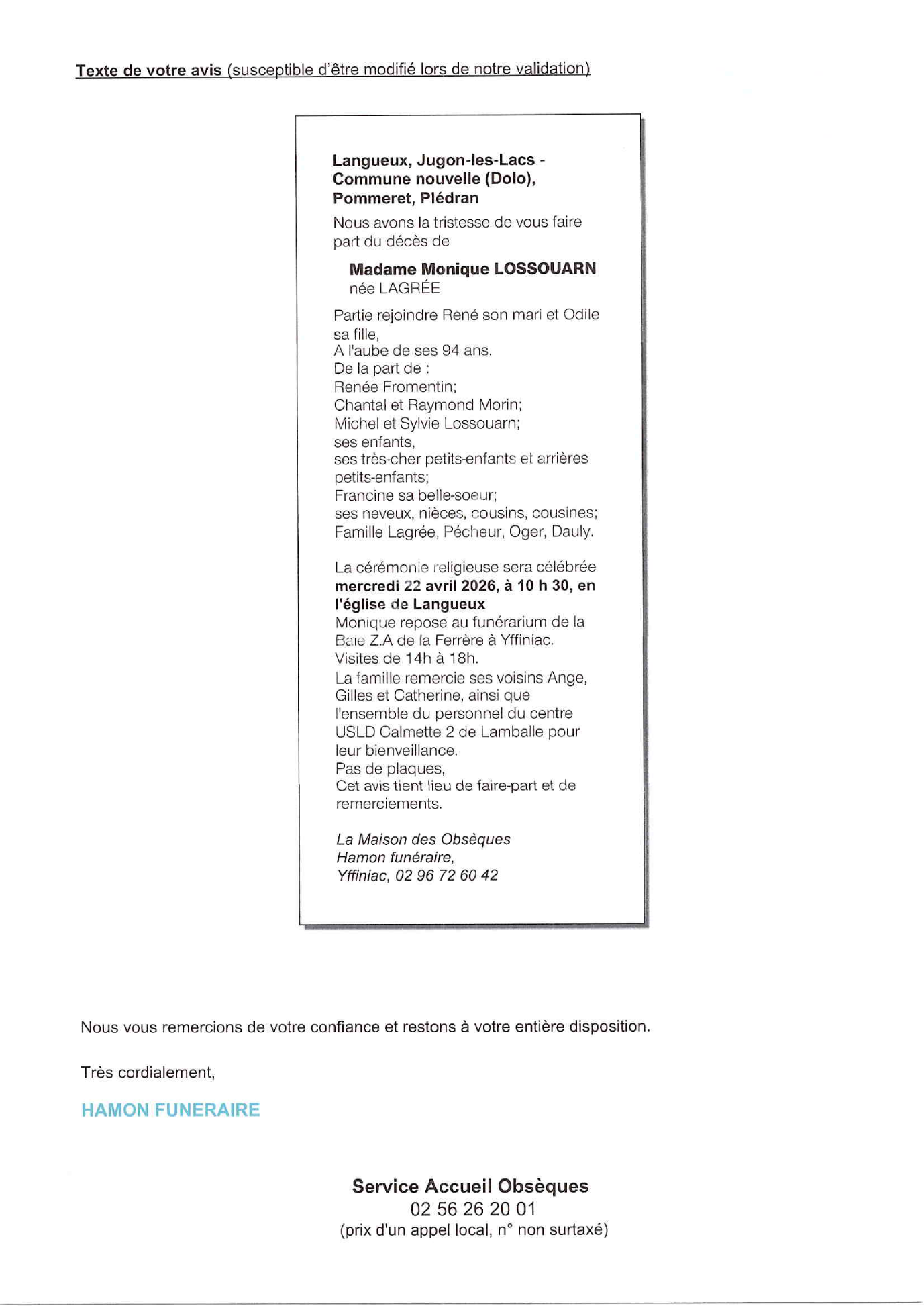 de Madame Monique LOUSSOUARN née LAGRÉE
