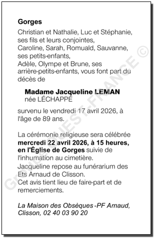 Cet espace « condoléances » est dédié à la mémoire de Madame Jacqueline LEMAN née LECHAPPE.