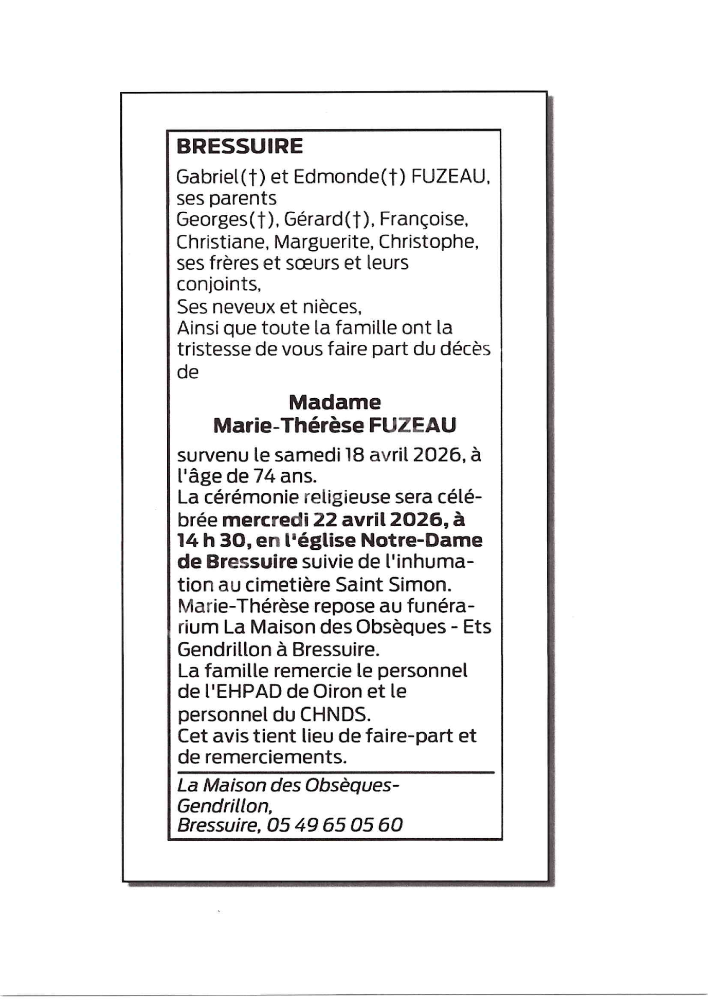 Cet espace « condoléances » est dédié à la mémoire de Madame Marie-Thérèse FUZEAU.