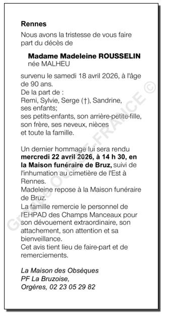 de Madame Madeleine ROUSSELIN née MALHEU
