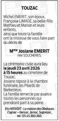 Cet espace « condoléances » est dédié à la mémoire de Madame Josiane EMERIT née SOUCHERES.