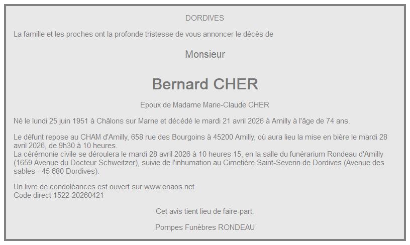 Cet espace « condoléances » est dédié à la mémoire de Monsieur Bernard CHER.
