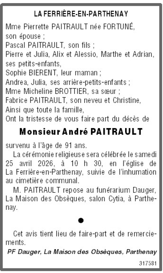 Cet espace « condoléances » est dédié à la mémoire de Monsieur André PAITRAULT.