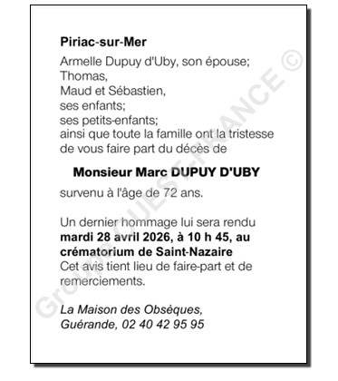 Cet espace « condoléances » est dédié à la mémoire de Monsieur Marc DUPUY d'UBY.