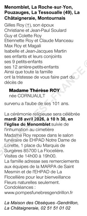 Cet espace « condoléances » est dédié à la mémoire de Madame Thérèse ROY née CORNUAULT.