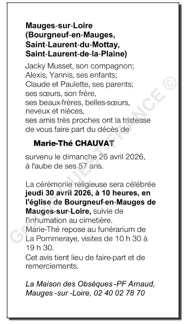 Cet espace « condoléances » est dédié à la mémoire de Madame Marie-Thé CHAUVAT.