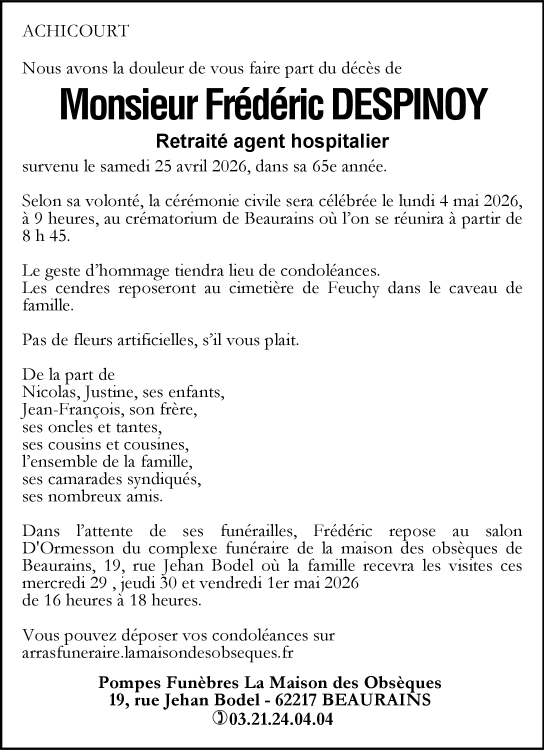 Cet espace « condoléances » est dédié à la mémoire de Monsieur Fréderic DESPINOY.