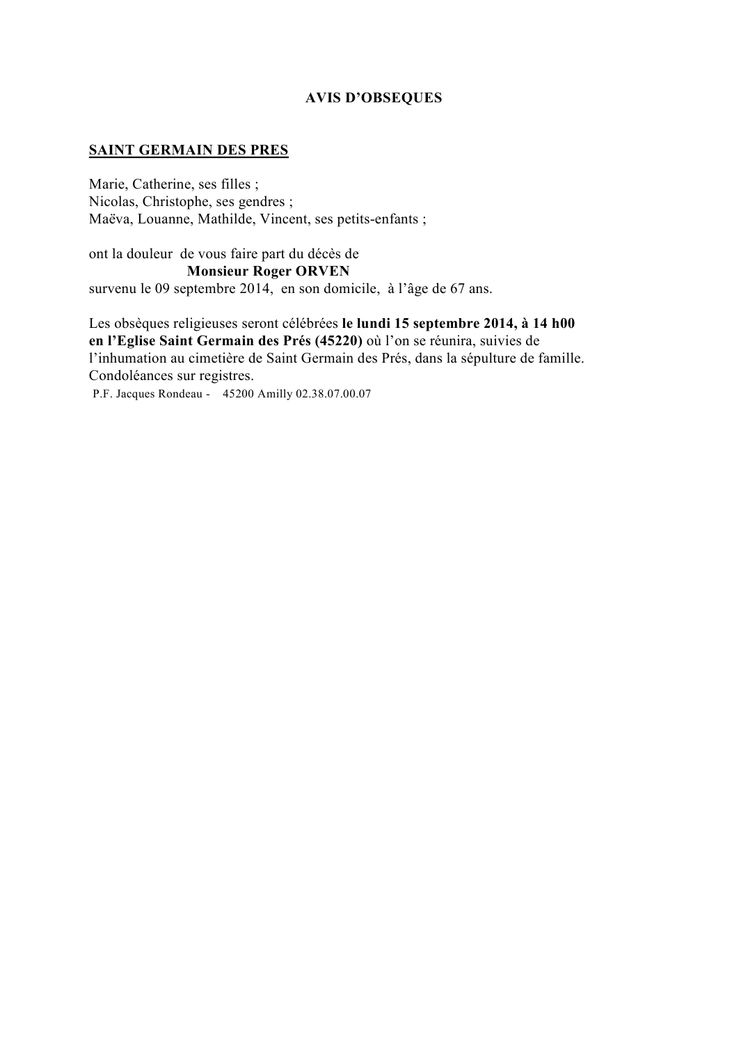 Décédé à Saint-Germain-des-Prés (45220) le mardi 9 septembre 2014