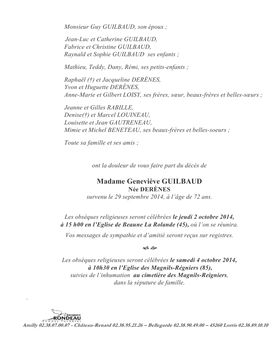 Cet espace « condoléances » est dédié à la mémoire de Madame Geneviève GUILBAUD née DERENES.