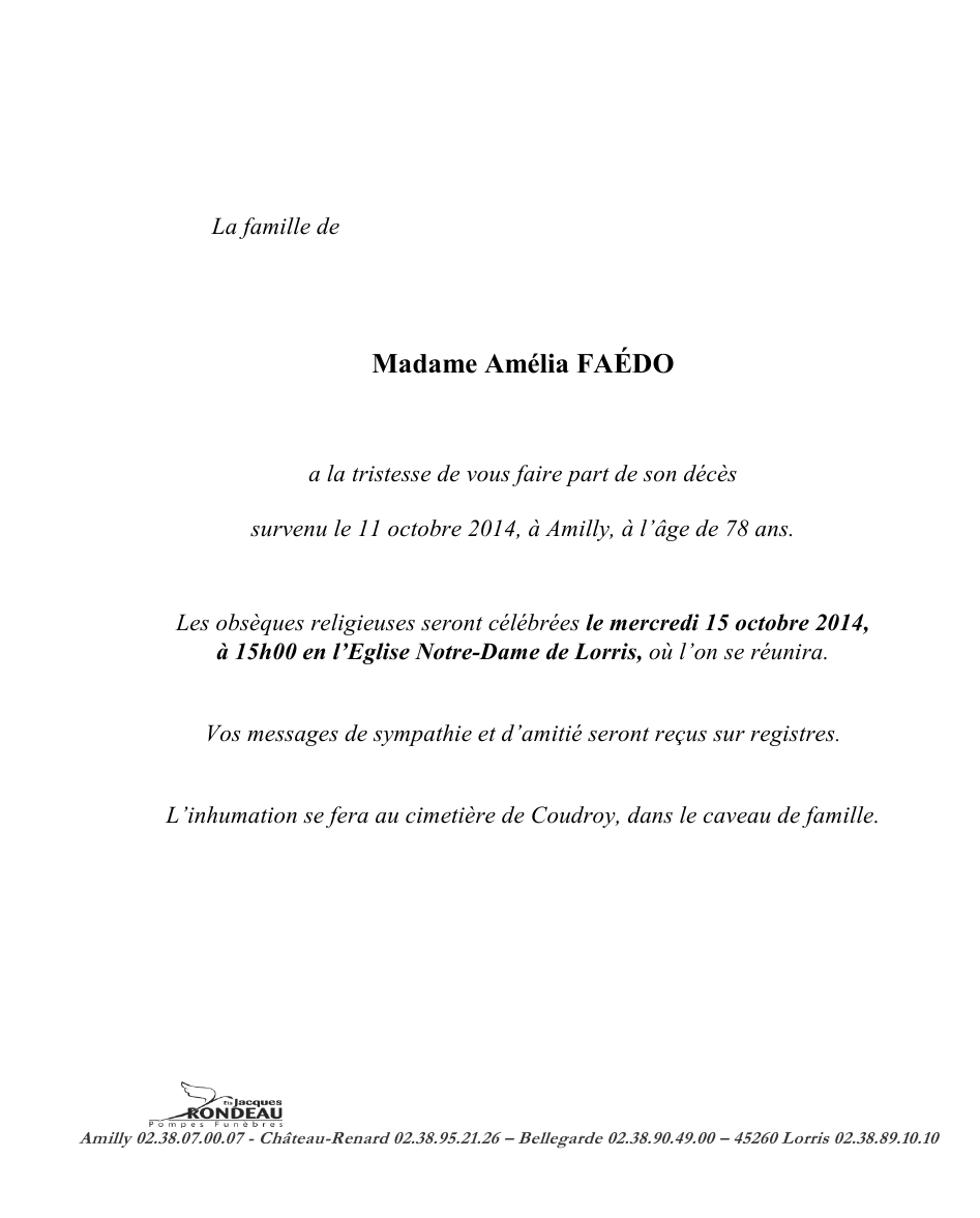 Cet espace « condoléances » est dédié à la mémoire de Madame Amélia FAEDO.