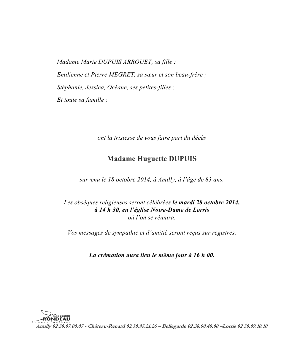 Cet espace « condoléances » est dédié à la mémoire de Madame Huguette DUPUIS.