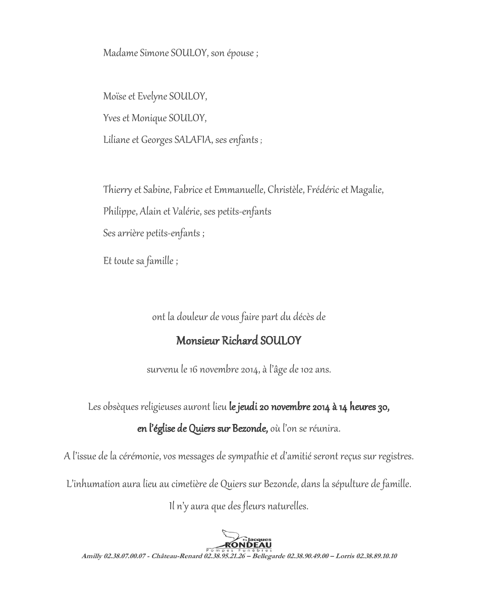 Cet espace « condoléances » est dédié à la mémoire de Monsieur Richard SOULOY.