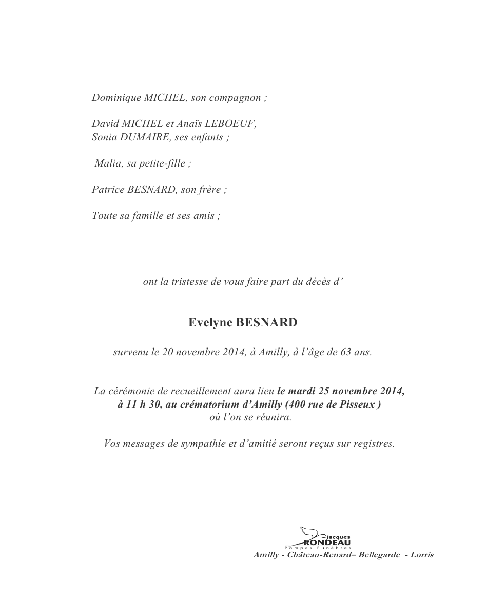 Cet espace « condoléances » est dédié à la mémoire de Madame Evelyne BESNARD.