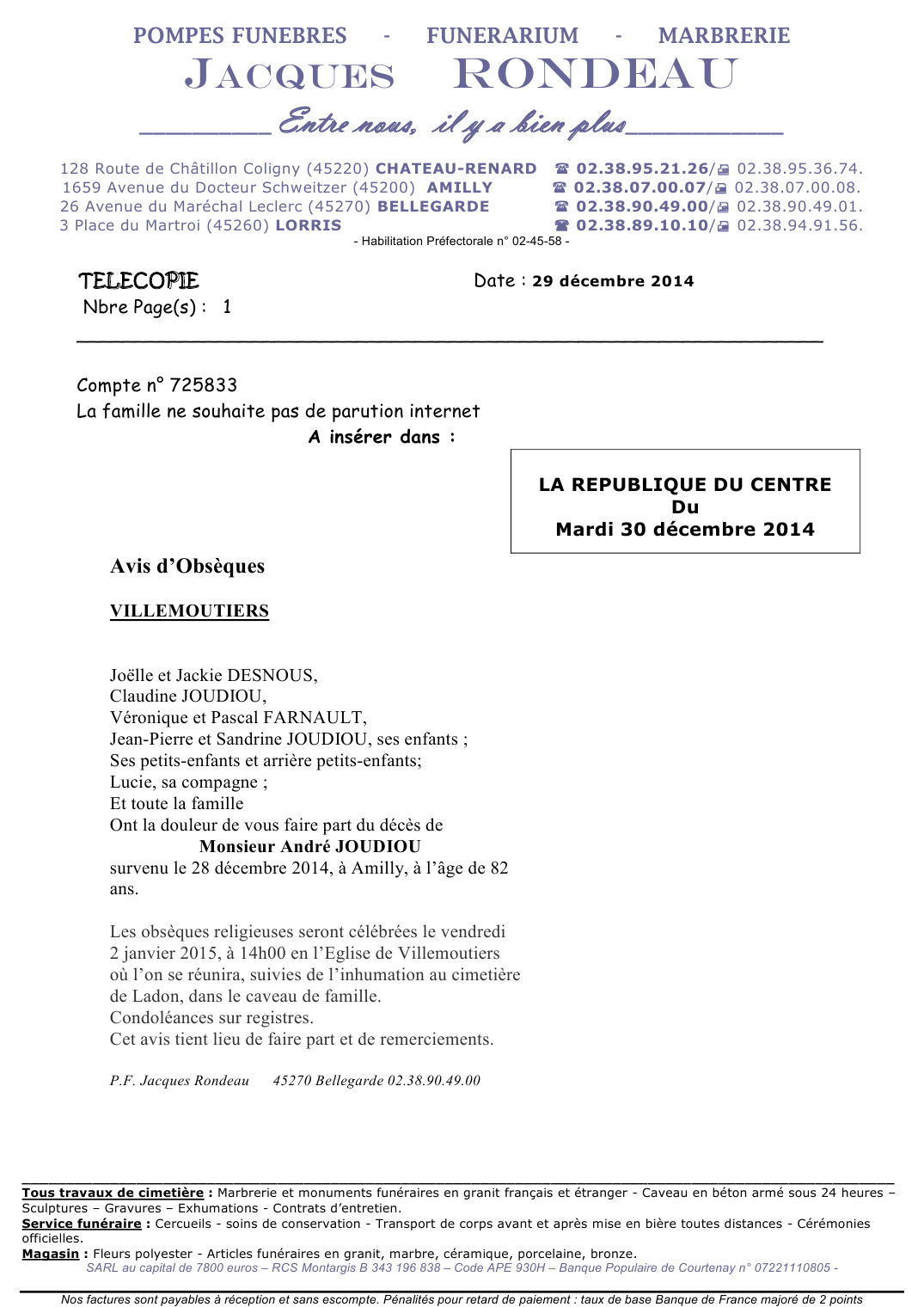 Cet espace « condoléances » est dédié à la mémoire de Monsieur André JOUDIOU.