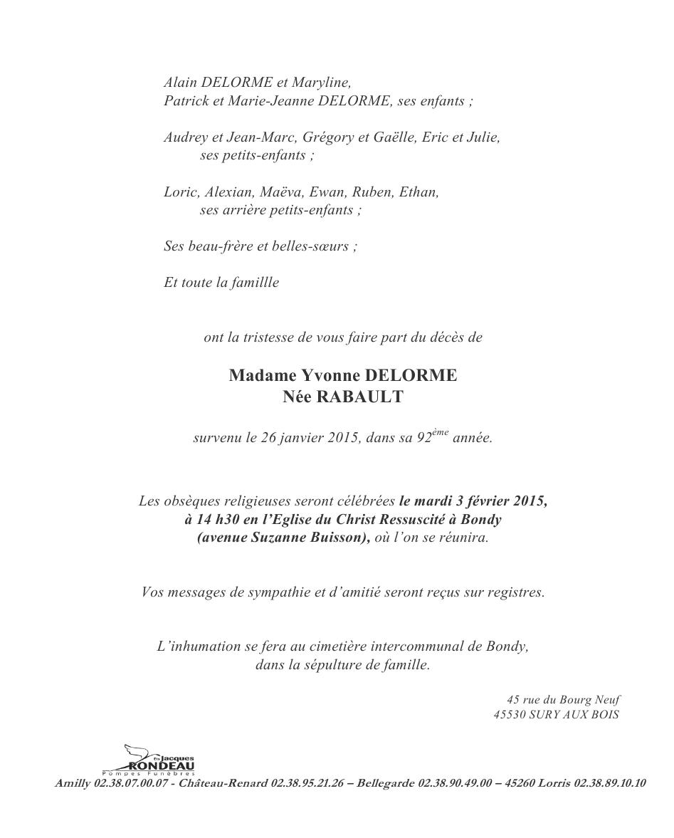 de Madame Yvonne DELORME née RABAULT