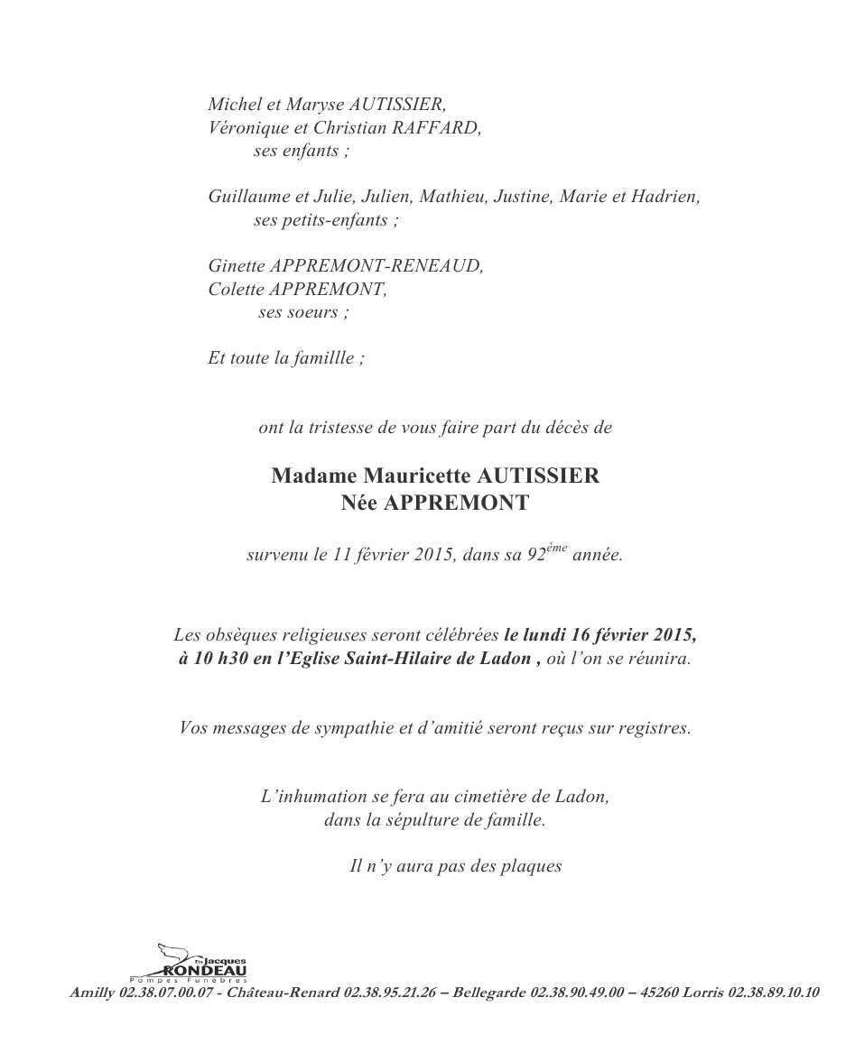 de Madame Mauricette AUTISSIER née APPREMONT