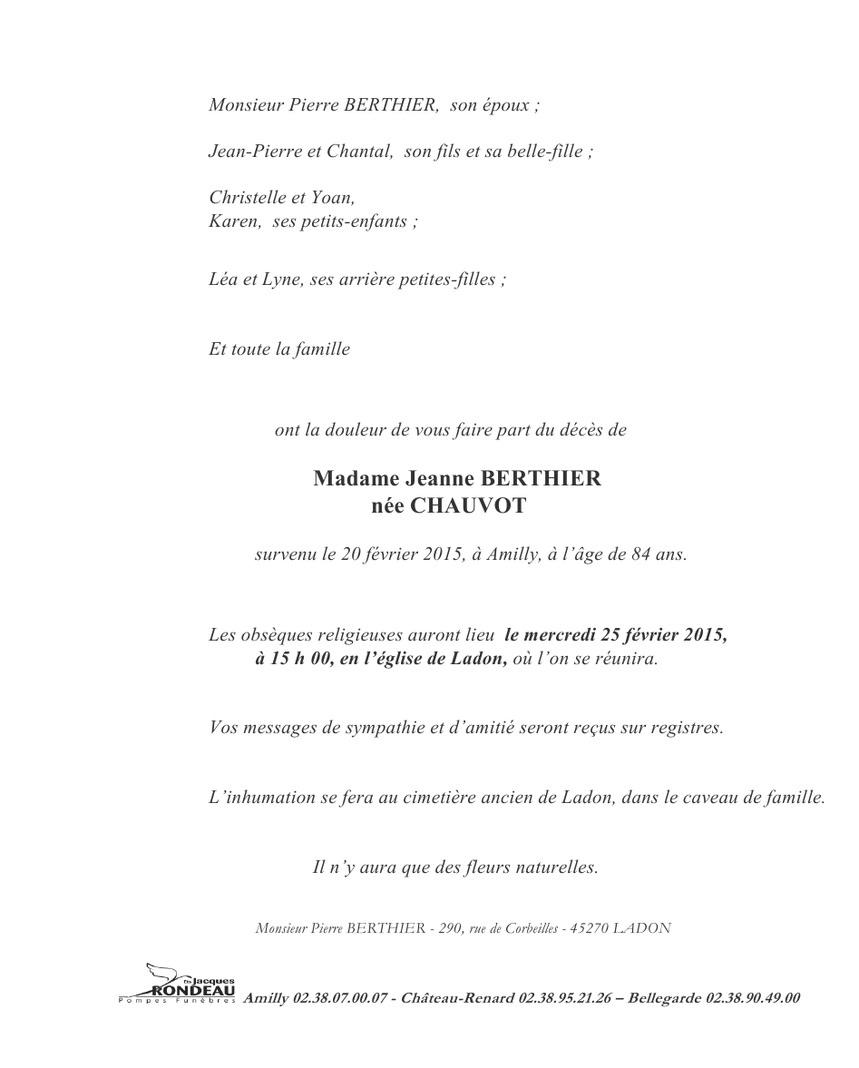 de Madame Jeanne BERTHIER née CHAUVOT