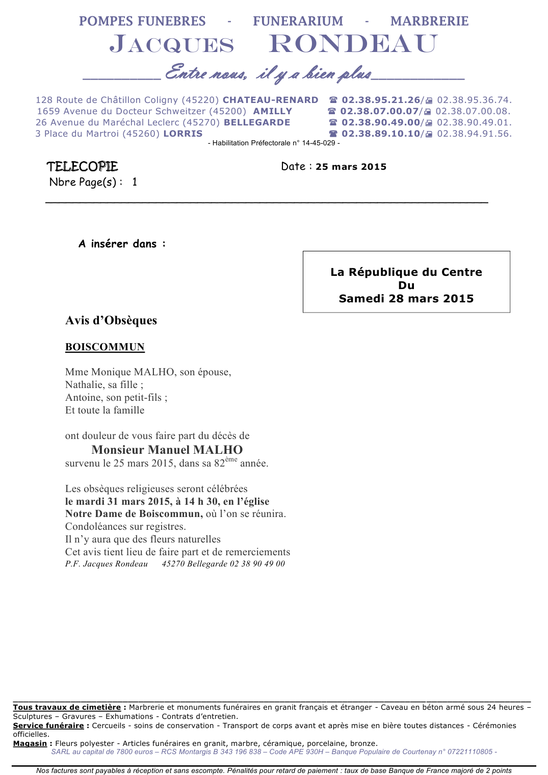 Décédé à Amilly (45200) le mercredi 25 mars 2015