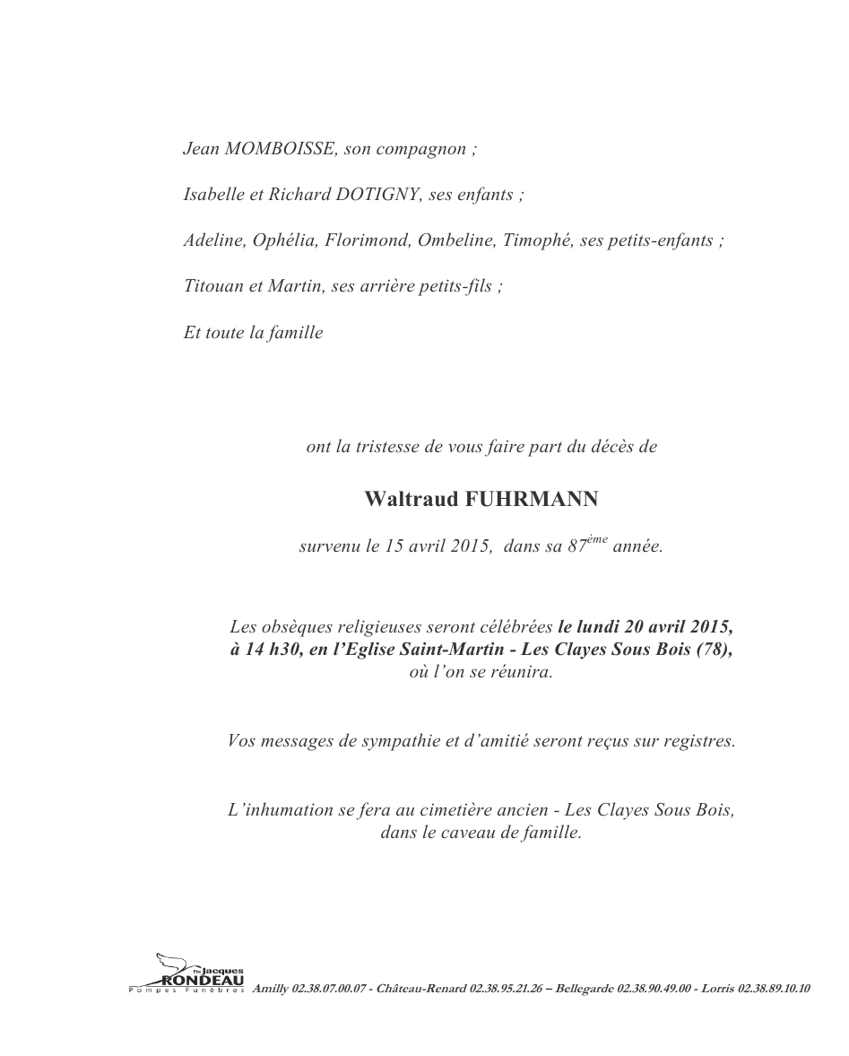 Cet espace « condoléances » est dédié à la mémoire de Madame Waltraud FUHRMANN.