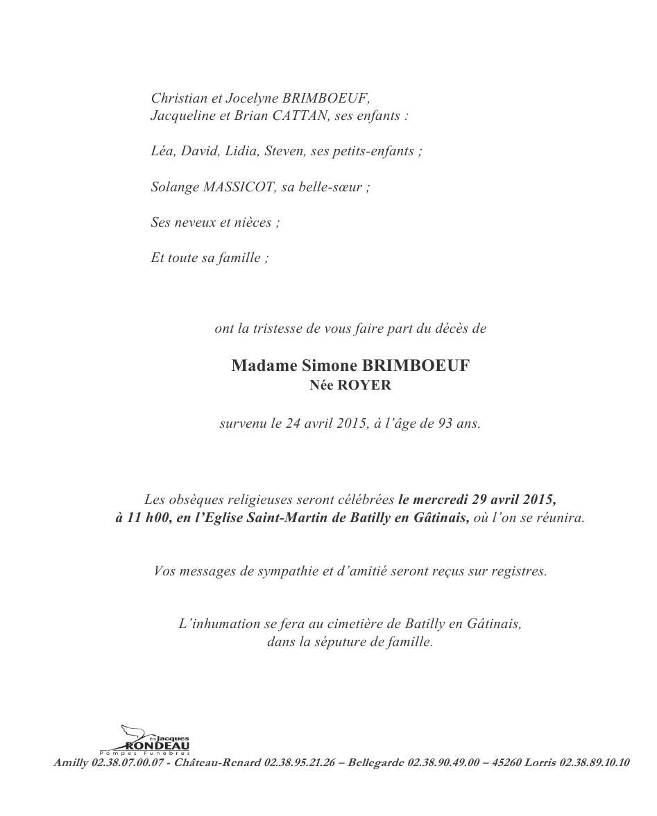 de Madame Simone BRIMBOEUF née ROYER