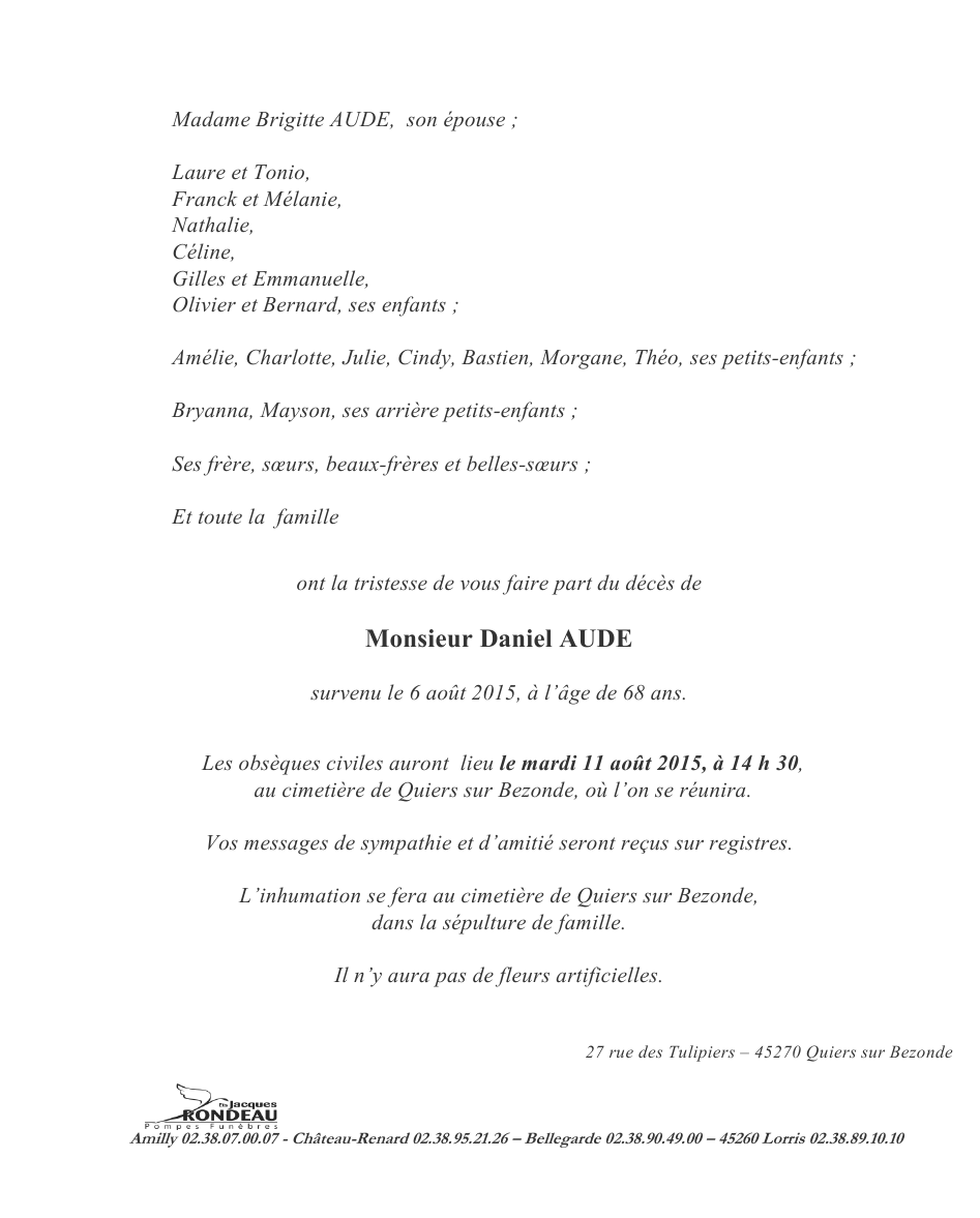 Cet espace « condoléances » est dédié à la mémoire de Monsieur Daniel AUDE.
