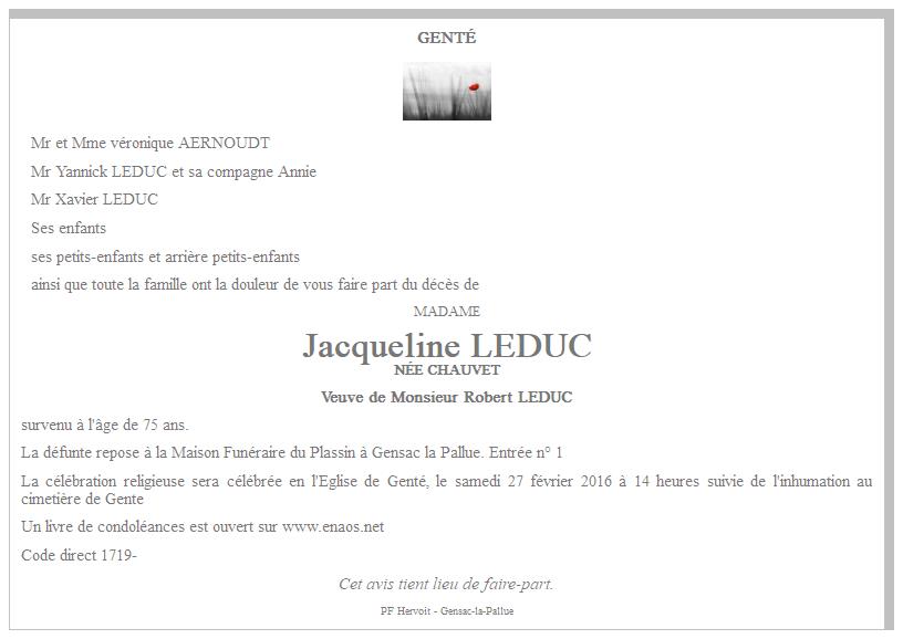 Cet espace « condoléances » est dédié à la mémoire de Madame Jacqueline LEDUC née CHAUVET.