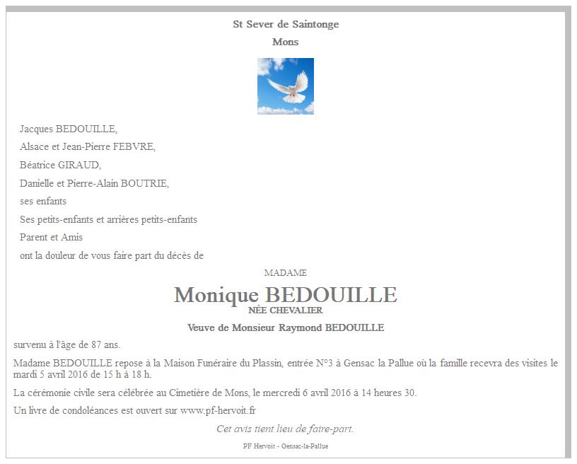 Cet espace « condoléances » est dédié à la mémoire de Madame Monique BEDOUILLE née CHEVALIER.