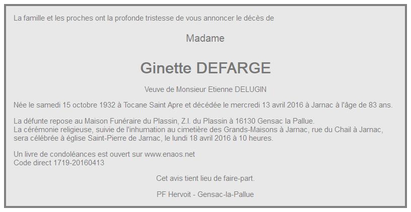 de Madame Ginette DELUGIN née DEFARGE