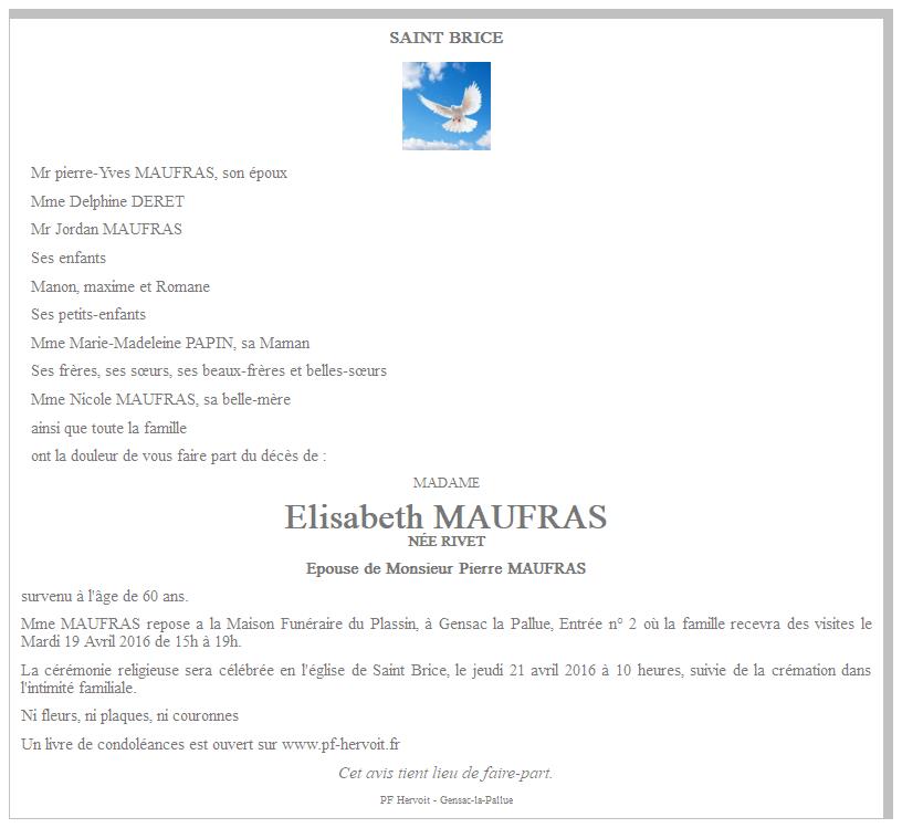 de Madame Elisabeth MAUFRAS née RIVET