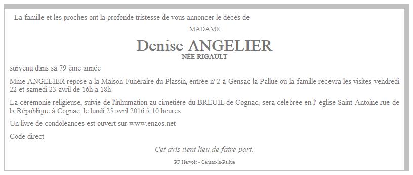 Cet espace « condoléances » est dédié à la mémoire de Madame Denise ANGELIER née RIGAULT.