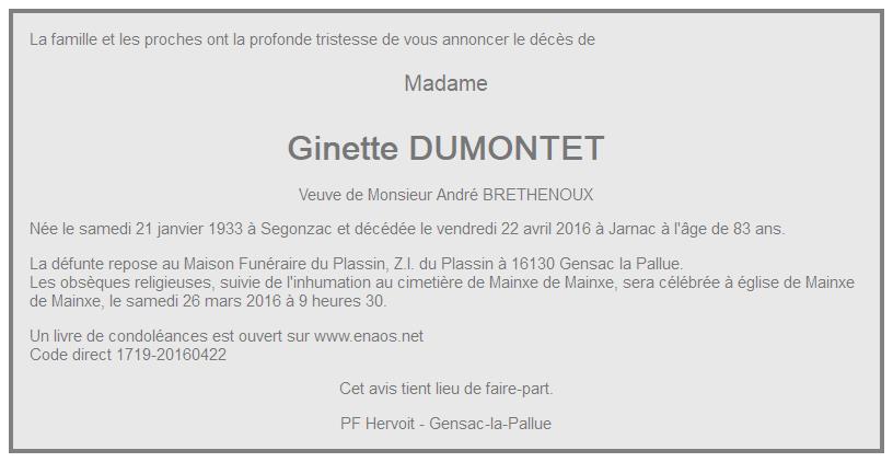Cet espace « condoléances » est dédié à la mémoire de Madame Ginette BRETHENOUX née DUMONTET.