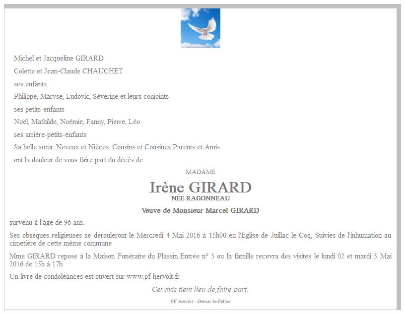 de Madame Irène GIRARD née RAGONNEAU
