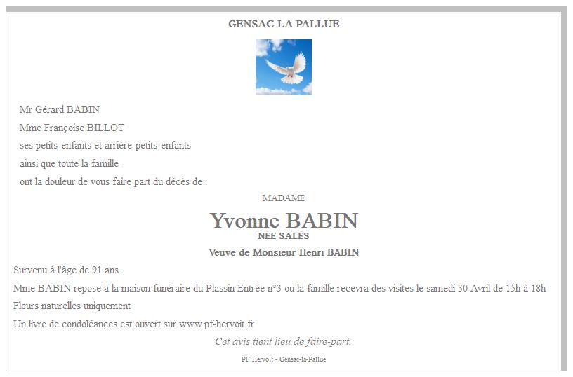 de Madame Yvonne BABIN née SALÈS