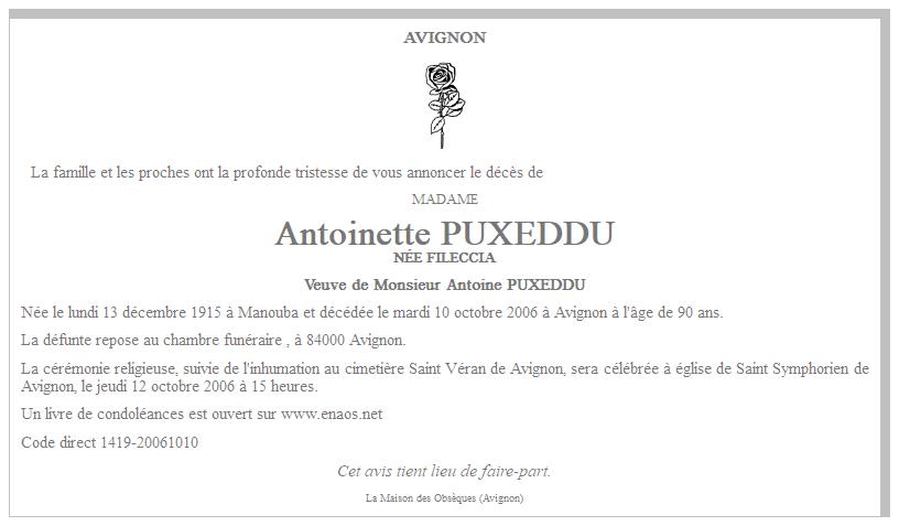 Cet espace « condoléances » est dédié à la mémoire de Madame Antoinette PUXEDDU née FILECCIA.