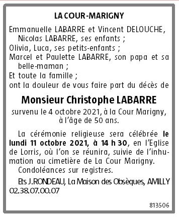Cet espace « condoléances » est dédié à la mémoire de Monsieur Christophe LABARRE.