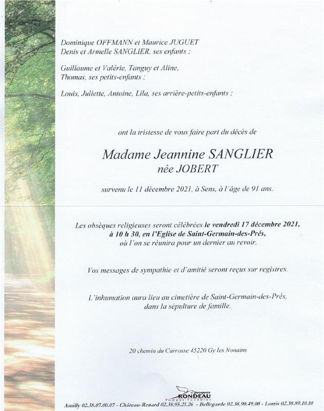 de Madame Jeannine SANGLIER née JOBERT
