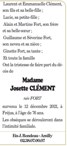 Cet espace « condoléances » est dédié à la mémoire de Madame Josette CLEMENT née FORT.