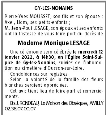 Cet espace « condoléances » est dédié à la mémoire de Madame Monique LESAGE née CHAUVETTE.