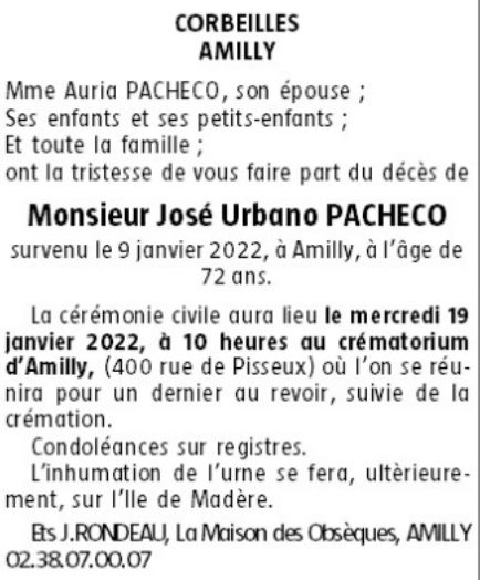 Cet espace « condoléances » est dédié à la mémoire de Monsieur José Urbano PACHECO.